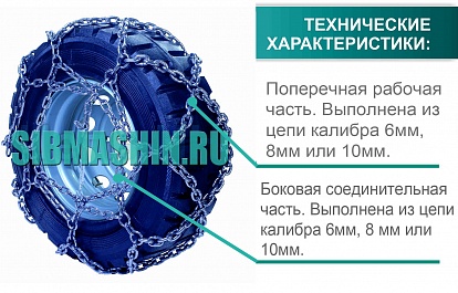 Цепи противоскольжения для погрузчиков и спецтехники тип «сота» изготавливаются из круглозвенной цепи калибрами 6/6мм, 8/8мм, 10/10мм (где первая цифра — калибр поперечной рабочей части цепи, вторая цифра — калибр боковой соединительной части цепи).